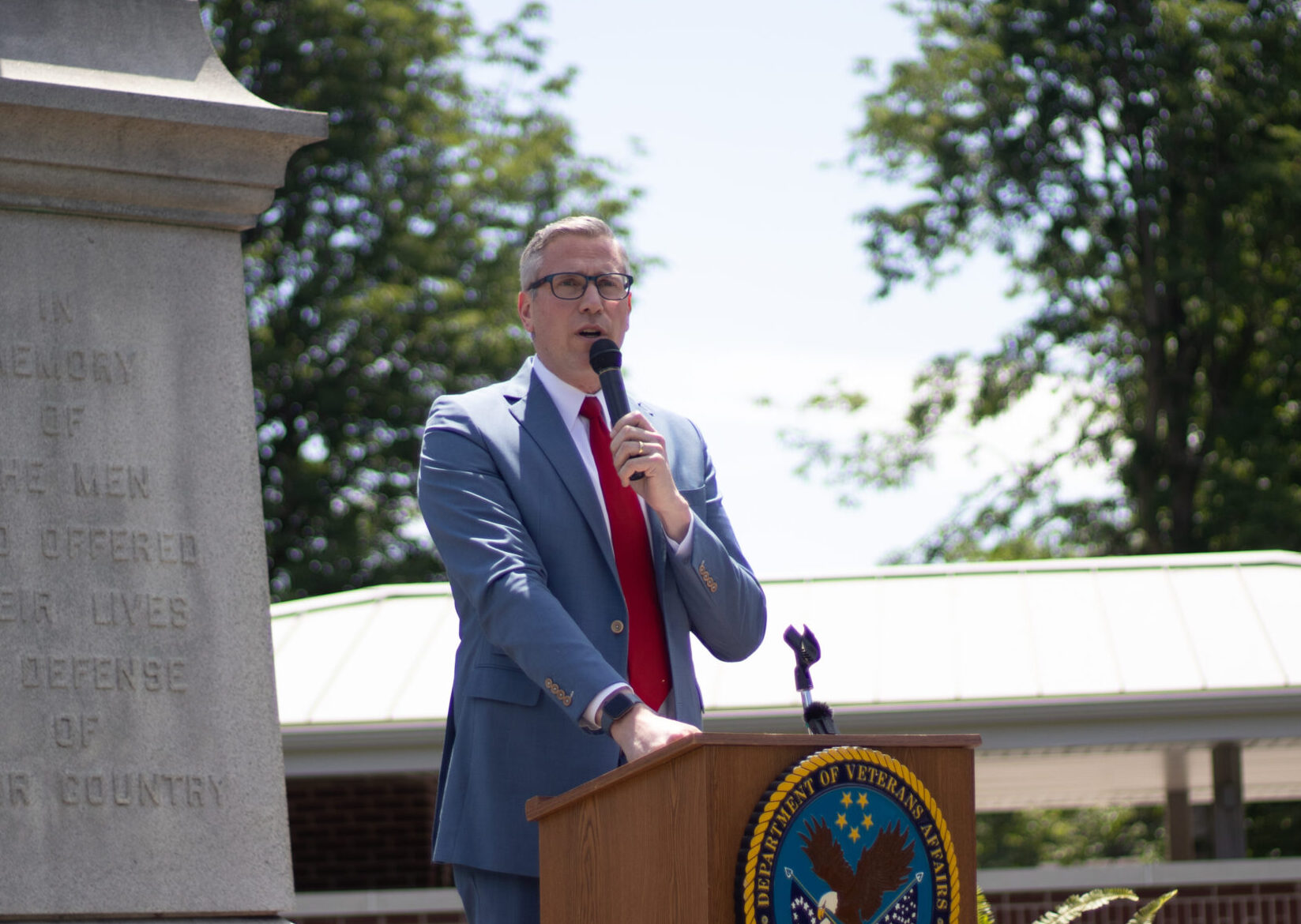 Champaign County Board Member Jeff Wilson's headshot (left). Congresswoman Nikki Budzinski speaks into a microphone (right).