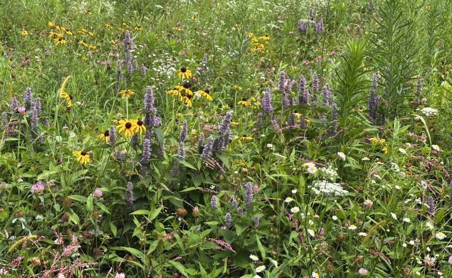 Native wildflowers bloom in an area of the farm that Lauren Lortensen is converting back to prairie. Leaves and stems act like rainfall speedbumps, allowing the soil to absorb more water. The roots also hold the soil in place, which reduces erosion, and take up excess moisture. Other benefits include carbon sequestration and nutrient cycling.