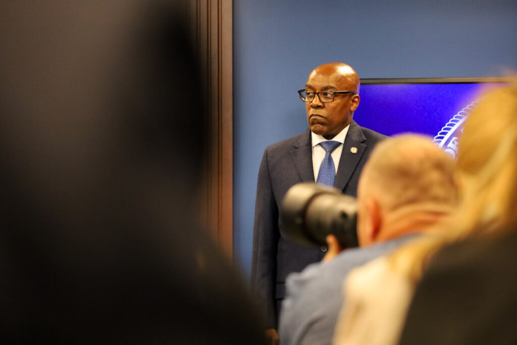 Andrew Adams/Capitol News Illinois Illinois Attorney General Kwame Raoul listens during a Sept. 2 news conference. Raoul called a potential military deployment in Chicago illegal.