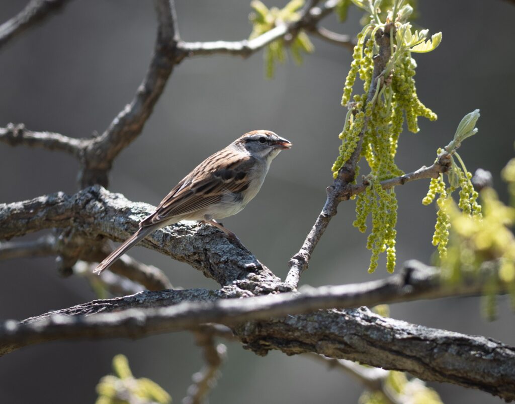 A chipping sparrow sits on a branch in suburban Kansas City, Missouri. Bird populations are declining more rapidly in areas with intensive agriculture, according to a study at Ohio State University.