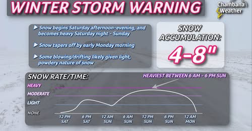 From IPM meteorologist Andrew Pritchard: A WINTER STORM WARNING goes into effect Saturday afternoon and lasts through the day Sunday for Champaign County and surrounding portions of east-central Illinois. Much of the day Saturday may be quiet and snow-free, with snow beginning to fall Saturday afternoon and evening. Snow will eventually become heavy during the day on Sunday, tapering off by early Monday morning. 4-8″ of total snowfall is expected in and near Champaign County. Northeast winds 10-15, gusting 20-25 mph at times may lead to blowing & drifting snow, especially in rural and open areas given the light and powdery nature of the snow.