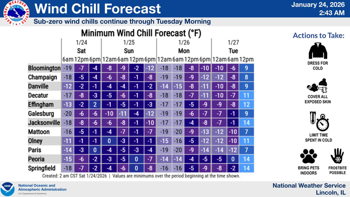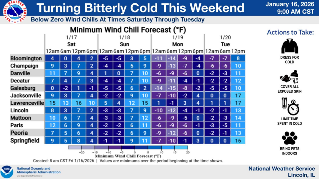 Meteorologists at the National Weather Service in Central Illinois are forecasting dangerously cold temperatures, with lows in the single digits and sub-zero wind chills each morning from Sunday through Tuesday.