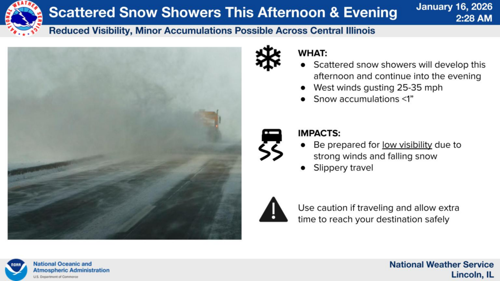 From the National Weather Service in Central Illinois: If you plan to travel tomorrow afternoon or evening, allow extra time as scattered moderate to heavy snow showers will be around. Accompanied by gusty winds, these could result in sudden, sharp visibility reductions, so be prepared to slow down should you encounter one.