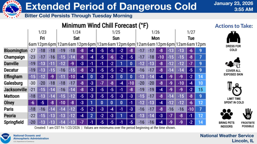 The National Weather Service in Central Illinois is forecasting another round of dangerous, cold temperatures by week’s end.