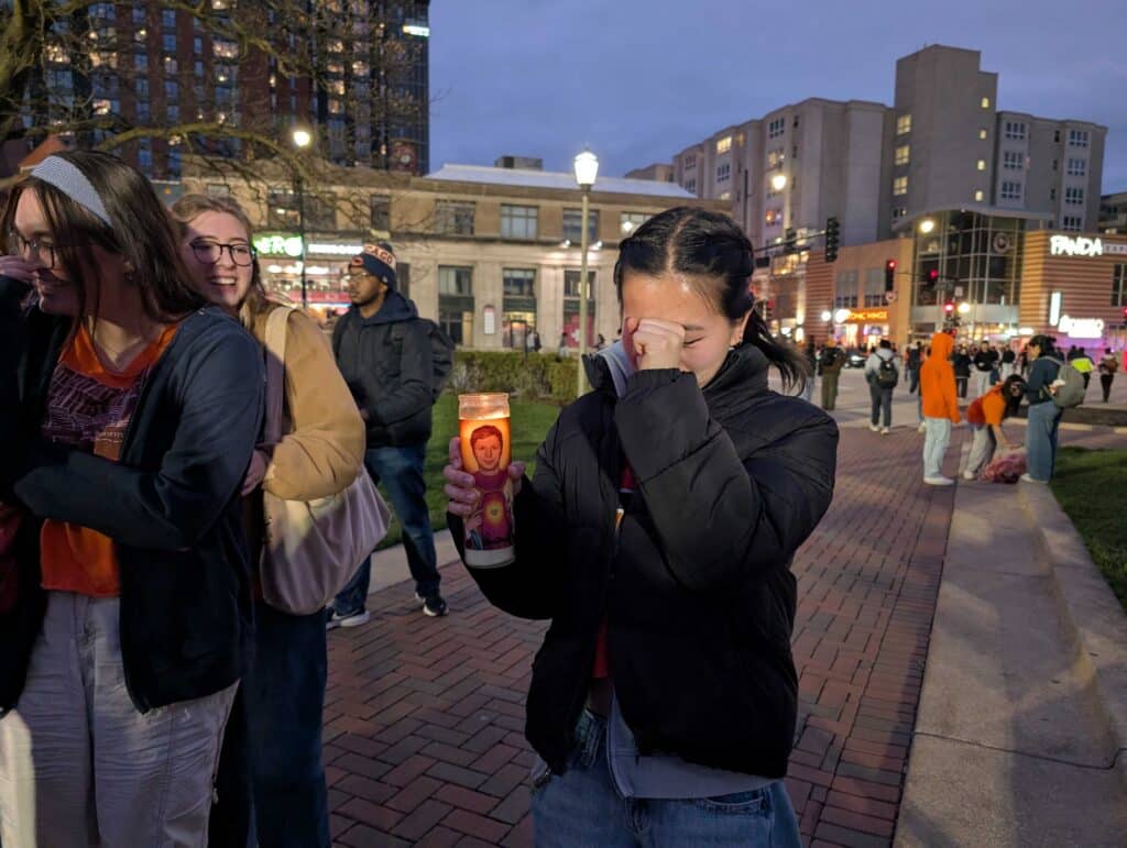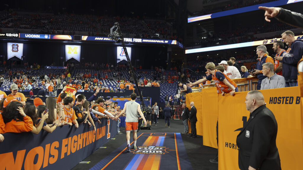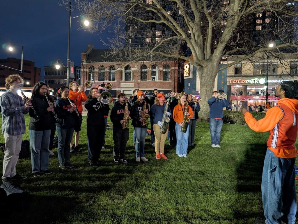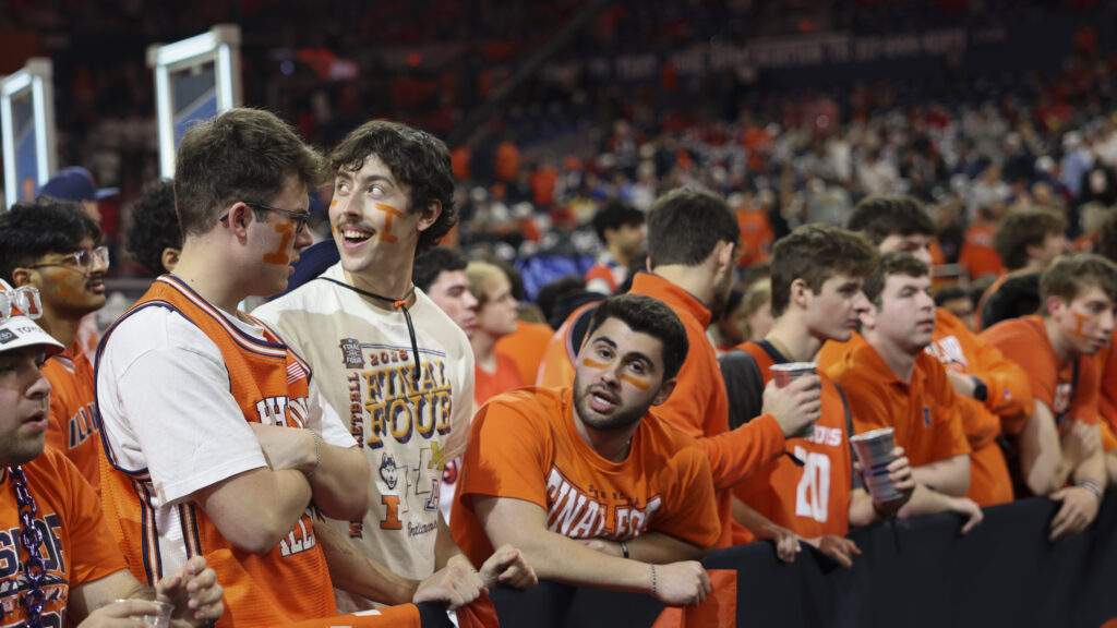 Elissa Eaton/IPM NewsElissa Eaton/IPM NewsElissa Eaton/IPM NewsElissa Eaton/IPM NewsUniversity of Illinois Senior Grace Liu holds a candle as she mourns the men’s basketball team’s loss to the University of Connecticut on April 4, 2026.Members of the University of Illinois marching band play songs to cheer the crowd up on April 4, 2026.Emily Hays/Illinois Public Media Ernest Smith was traveling to Champaign for work. A fellow Midwesterner and basketball fan, he decided to stop into Neil St. Blues to watch the Final Four March Madness game.