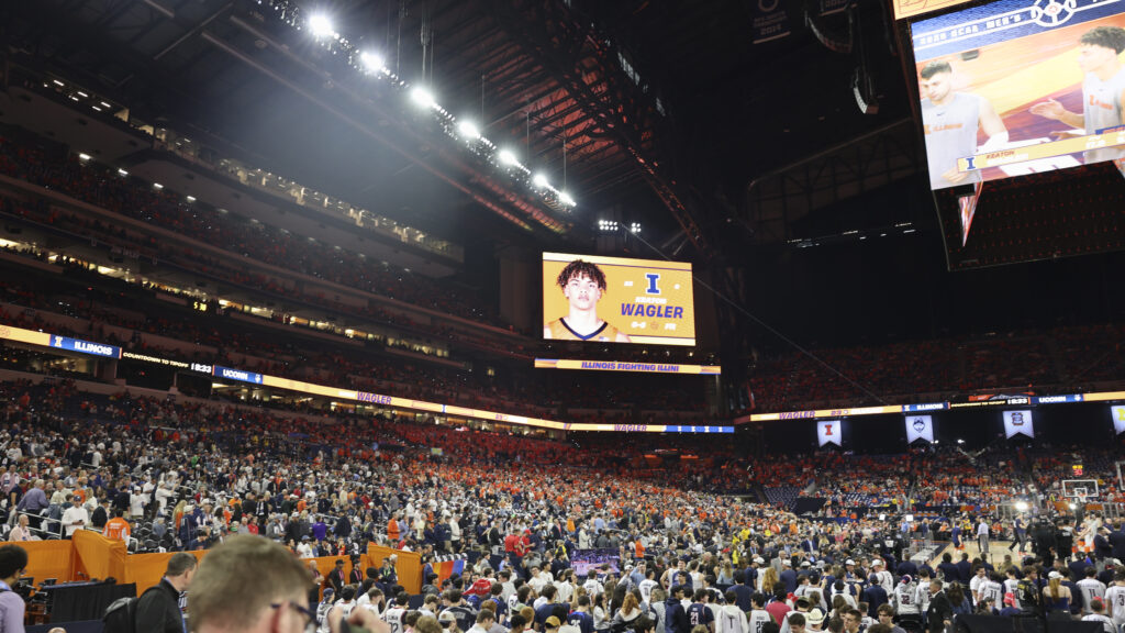 Sports fans gather at Lucas Oil Stadium on April 4, 2026 for the Final Four Men's Basketball game against UConn.
