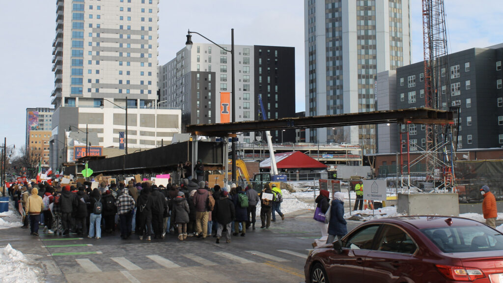 On Green Street in Urbana, more than 1,000 people braved below-freezing temperatures to gather near the U of I Alma Mater. Protesters cut off traffic for three blocks at a time as they marched down Green Street from Wright to First Street.