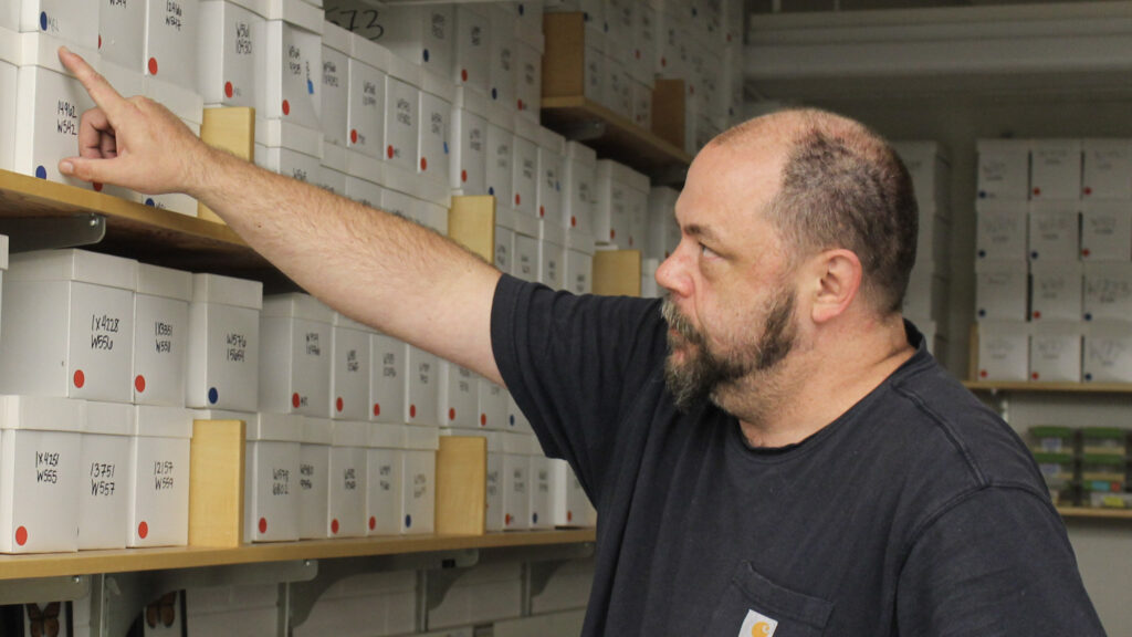 Emily Hays/IPM News U of I Evolution, Ecology and Behavior Professor Charles Roseman often studies genetic variation in baboons. His lab has a thousand baboon skeletons stored in boxes around the walls.