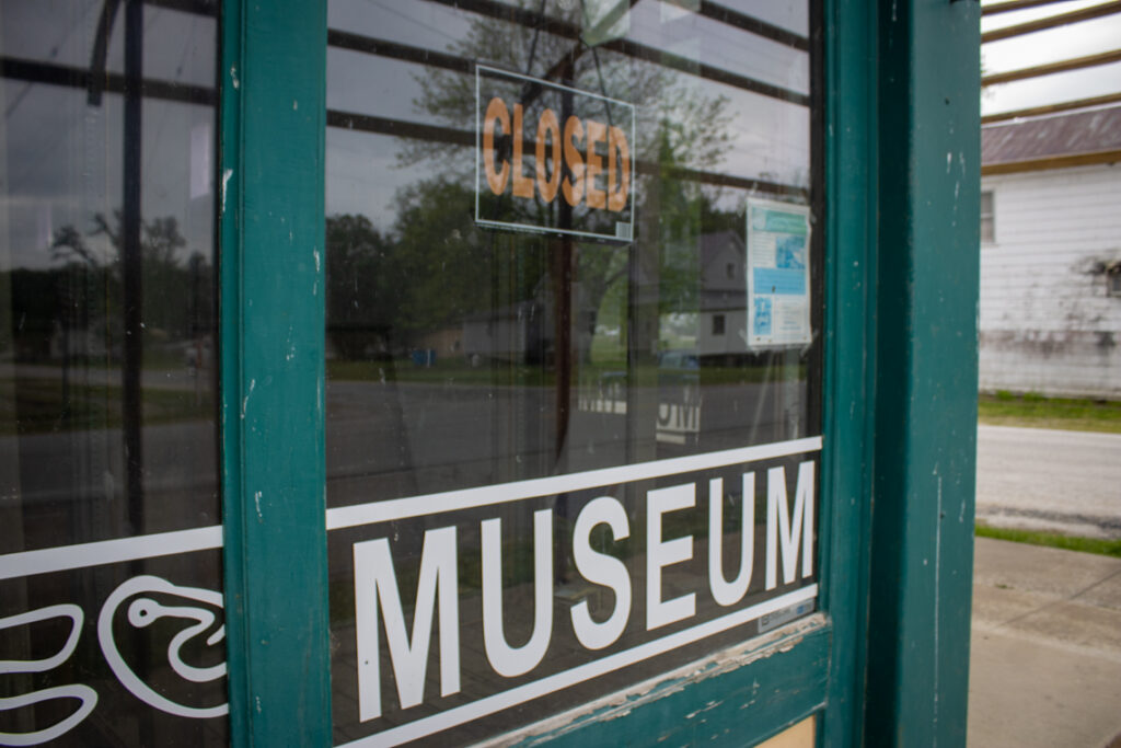 A sign shows the word “CLOSED” in the front window of the Center for American Archeology. The Center was closed in 2019 because of flooding, and no artifacts held by the museum were damaged. Bridgette Fox/Capitol News Illinois