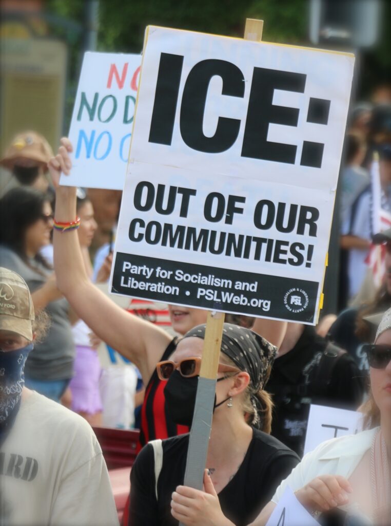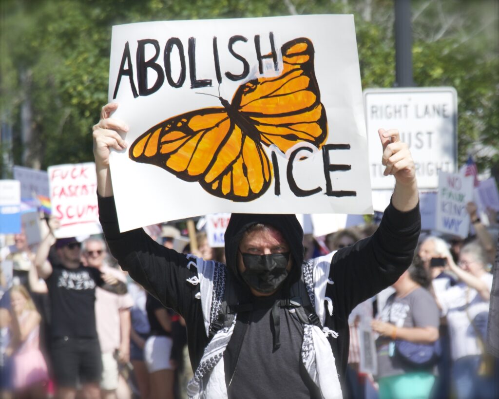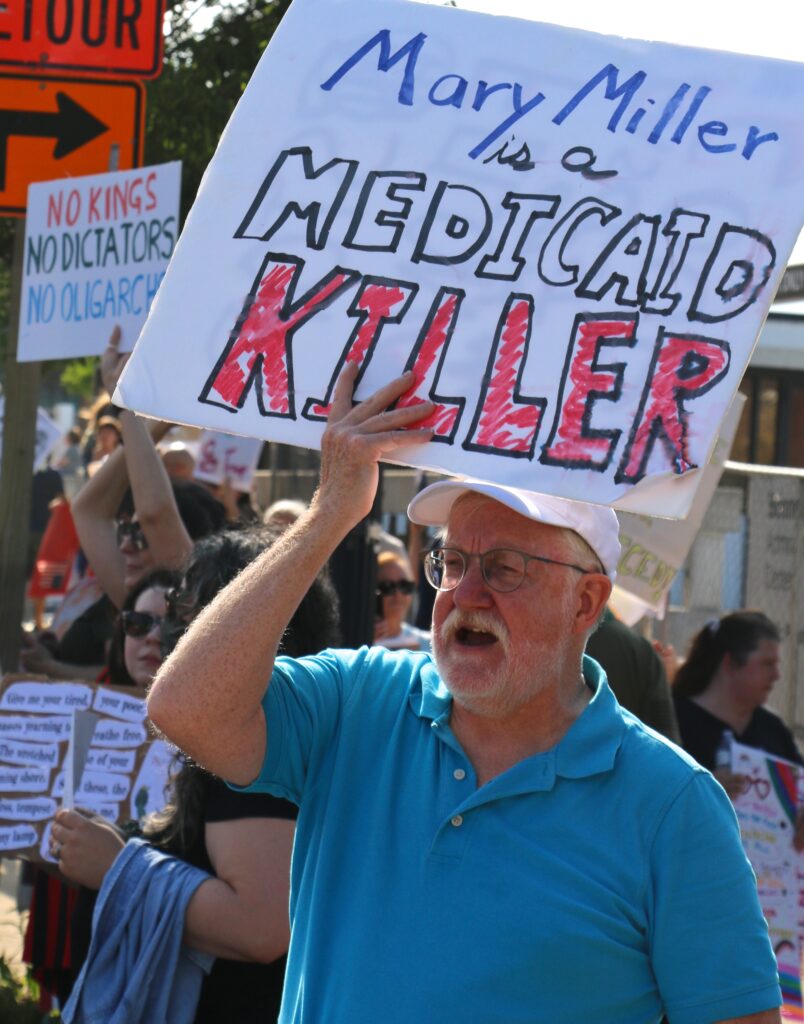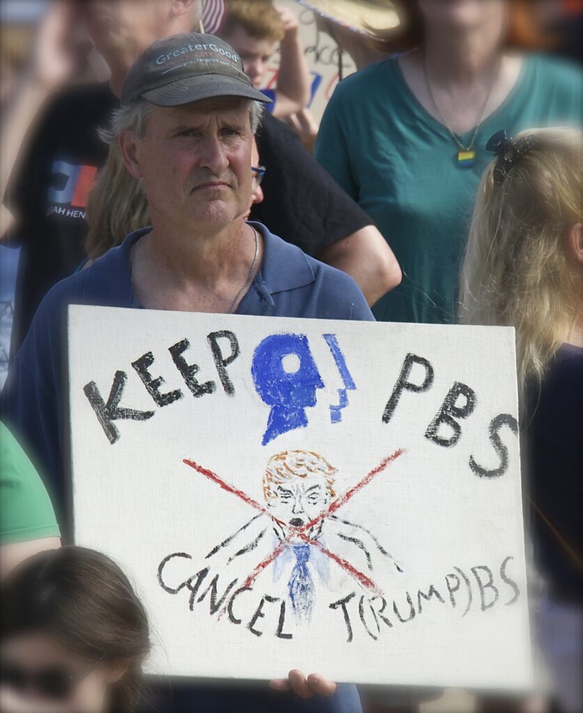 At a June 14, 2025 rally in Urbana, a protester holds a sign supporting public broadcasting and criticizing President Trump, who ordered Congress to rescind funding for NPR and PBS.