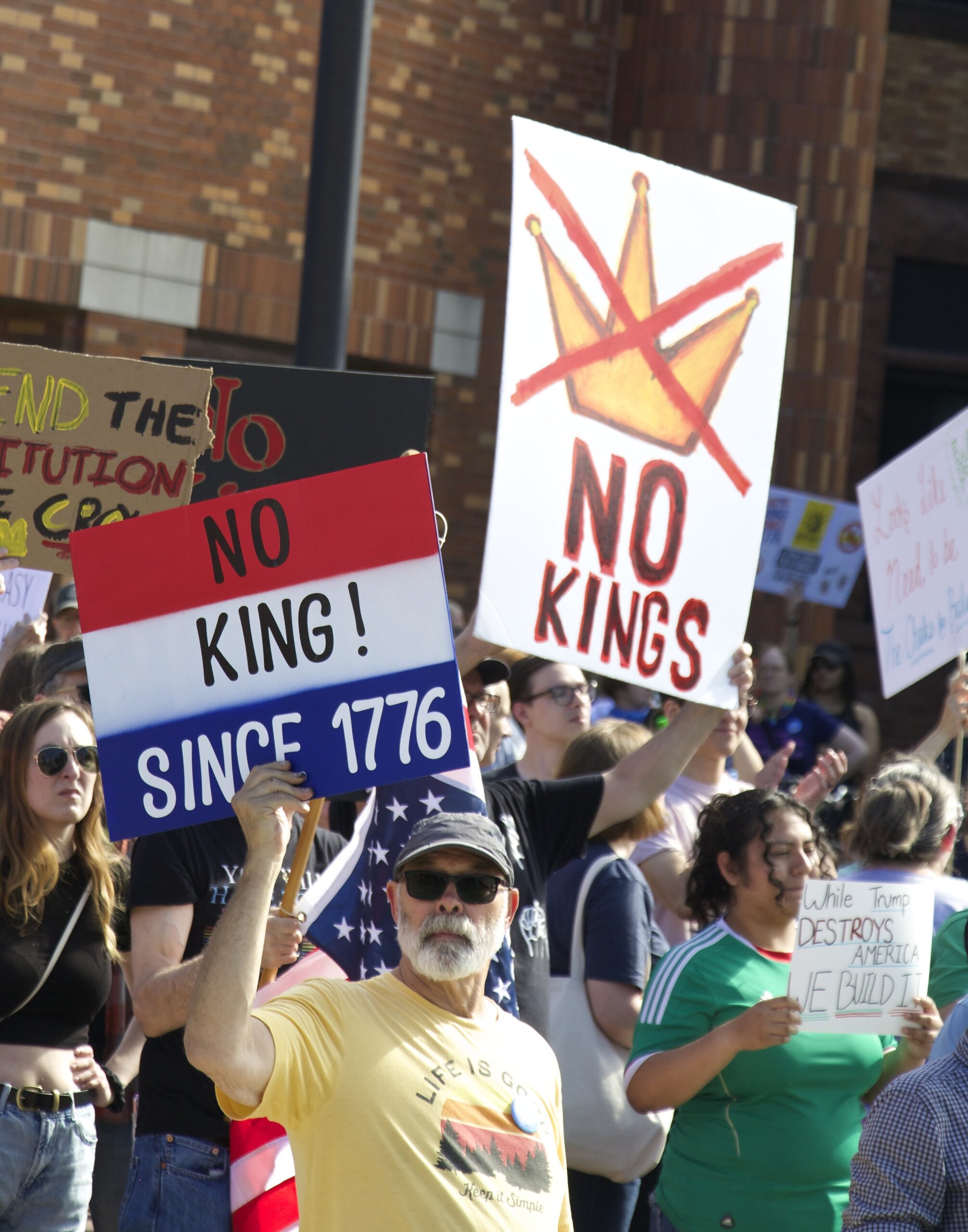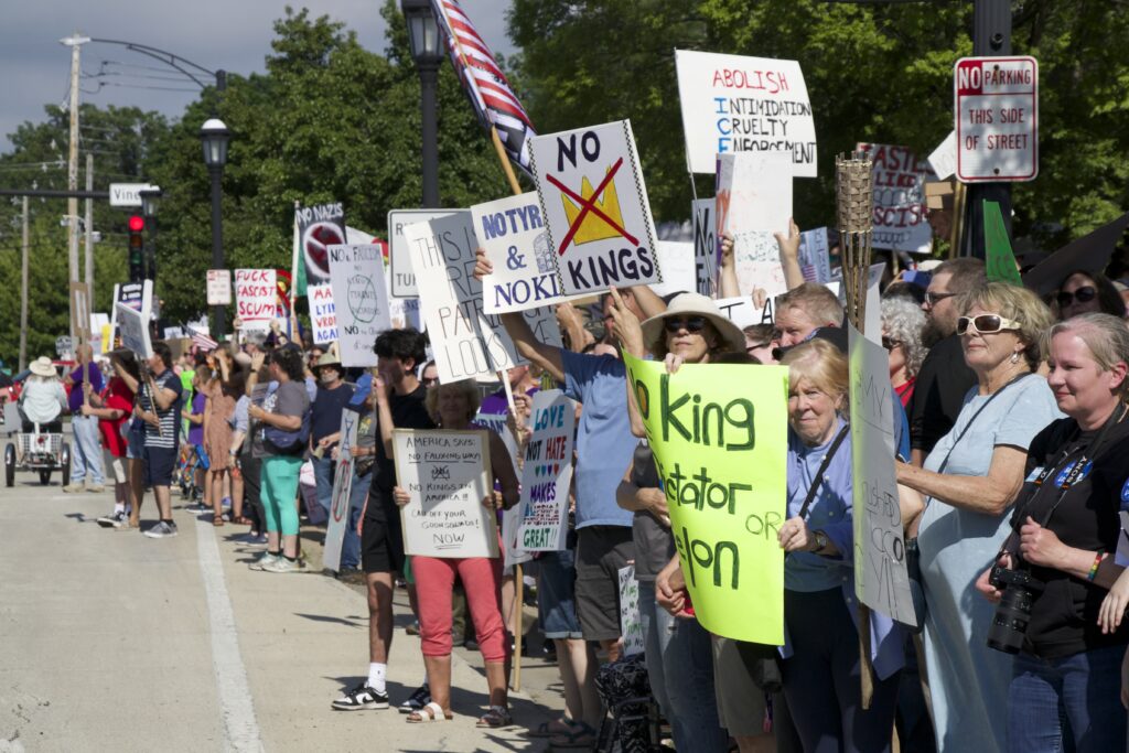 Thousands of protesters participate in the ‘No Kings’ rally in front of the Champaign County Courthouse in Urbana on June 14, 2025.