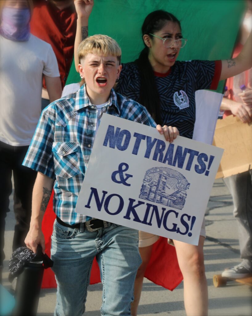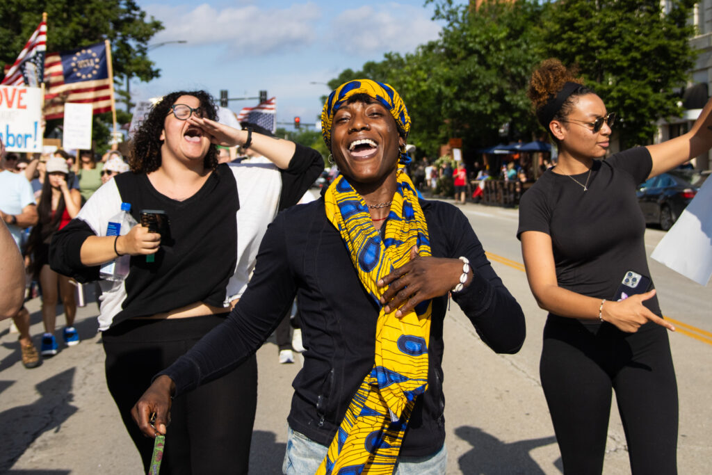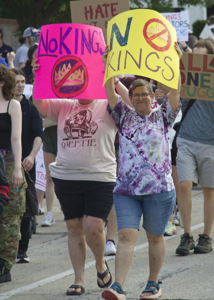 Three women chant and encourage other protesters as they march down Main Street at the “No Kings” protest in Urbana on June 14, 2025. Community members of all ages attended the protest, carrying signs, flags and balloons condemning the actions of President Trump. (Sam Rink/IPM News)