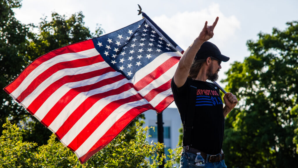 A protester holds an American flag and gives a gesture to passers by at the “No Kings” protest in Urbana, Illinois on June 14. (Sam Rink/IPM News)