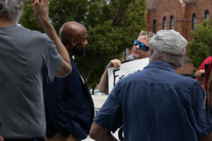 He ultimately did not speak at the event, but after sudden thunderstorms forced attendees inside, some protesters brought their signs with them and approached him after speeches had been given.