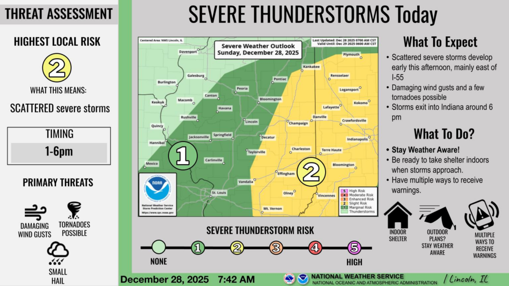 IPM meteorologist Andrew Pritchard advises central Illinoisans stay ‘weather aware’ on Sunday and Monday. Pritchard wrote that two main round of storms are expected across central Illinois today. The first round between 9:00 a.m.-noon may clip Champaign County.