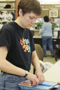 Olivia Dvorak/Illinois Student Newsroom Youth Services & Programming Librarian Becca Strom tapes the spines of worn children’s books. Library officials say the proposed expansion will include a new 7,200-square-foot children’s library with a dedicated Teen Room, a large dividable community room and a covered outdoor patio.