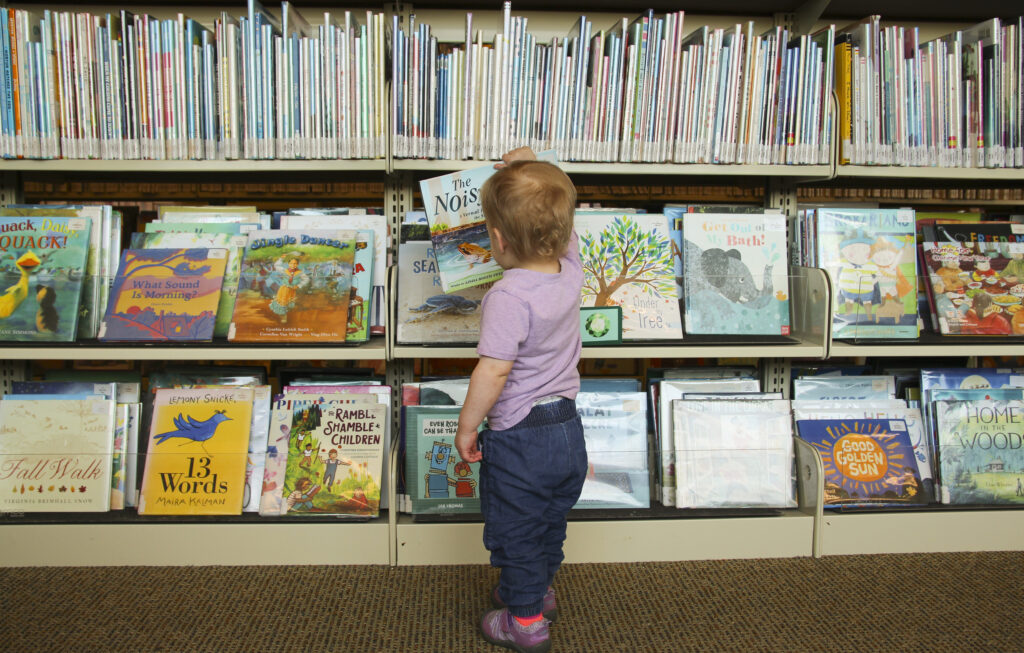 Olivia Dvorak/Illinois Student Newsroom Isabel Hillinger, 1, picks out a book in the children’s section of the library. Children’s books are among the most frequently checked-out items, and library officials say the expansion would add space for their collection.